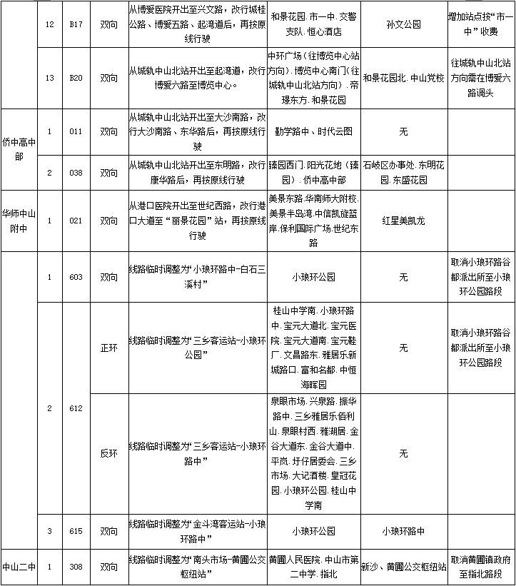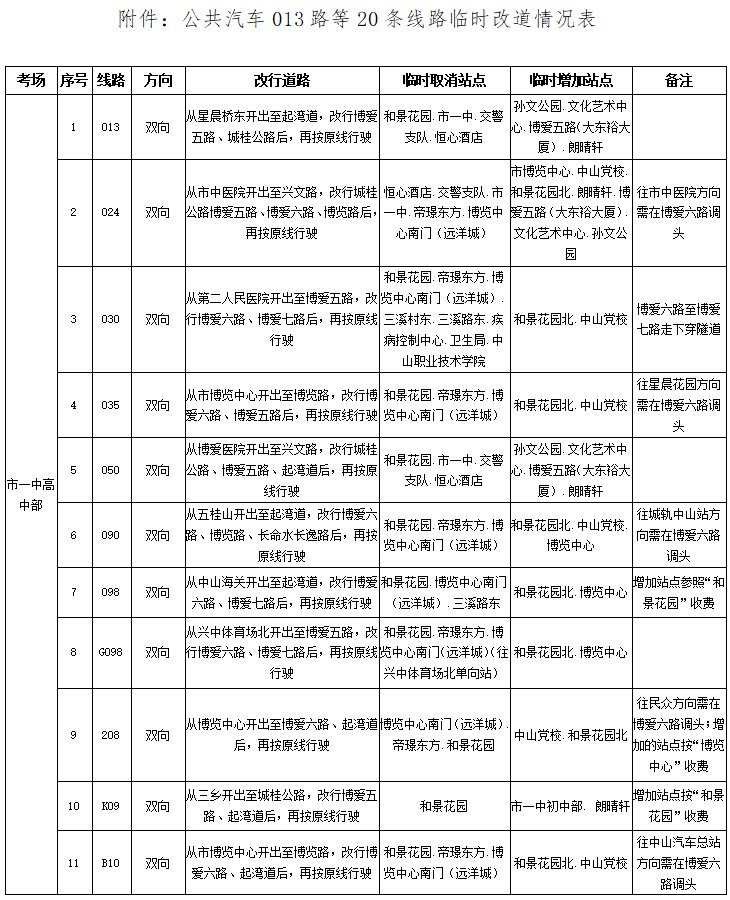 2020年全国普通高考、高职招生及高中学业水平考试将于7月7日至10日举行,为配合考试工作顺利开展,交警部门将对市一中高中部等10个考场门口及周边路段实施交通管制措施,其中市一中高中部、市华侨中高中部、华师中山附中、桂山中学、中山二中的交通管制将对部分公共汽车线路造成影响,需临时改道行驶,交通管制时间为7月7日、8日8:30-11:30、14:30-17:00;7月9日8:30-11:40、14:30-17:40;7月10日8:30-11:40,具体改道情况见附件。