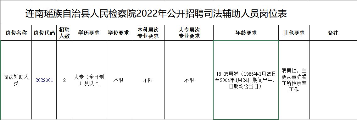 司法辅助人员2人,限男性,主要从事驻看守所检察室工作。