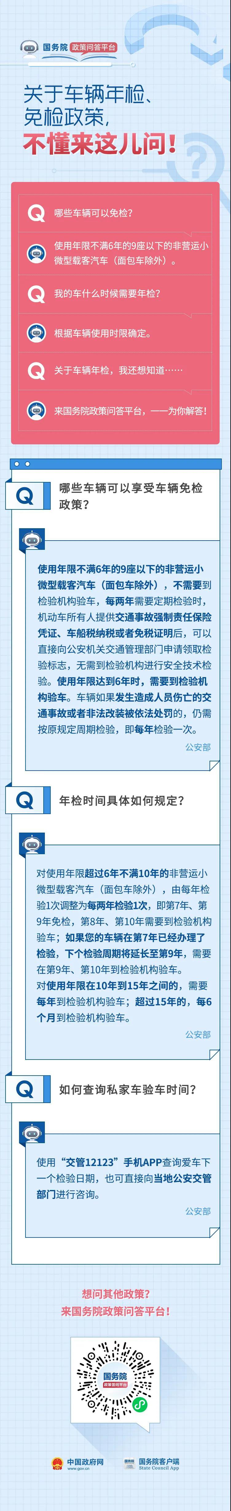 在下图中,我们可以看到,哪些车辆可以享受车辆免检的政策?年检的时间是如何规定的?去哪里查询私家车验车时间?