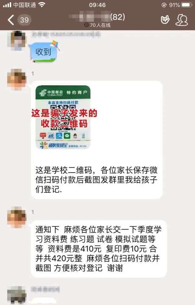 二要谨慎付款。如家长群中有发布收取费用信息等,要及时到学校网站核实或与老师电话沟通核实,不要在家长群中发布的来源不明的二维码上付款。