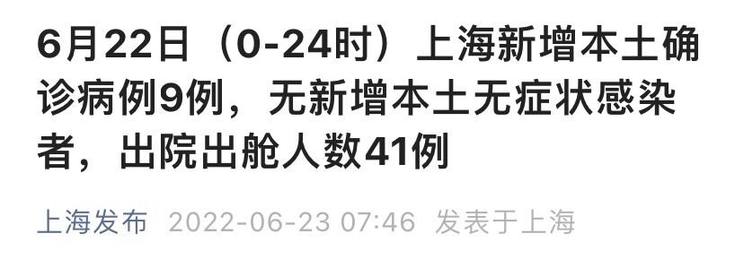 上海市卫健委6月23日通报:2022年6月22日0—24时,上海新增本土新冠肺炎确诊病例9例,均在隔离管控中发现,无新增本土无症状感染者,详情如下。