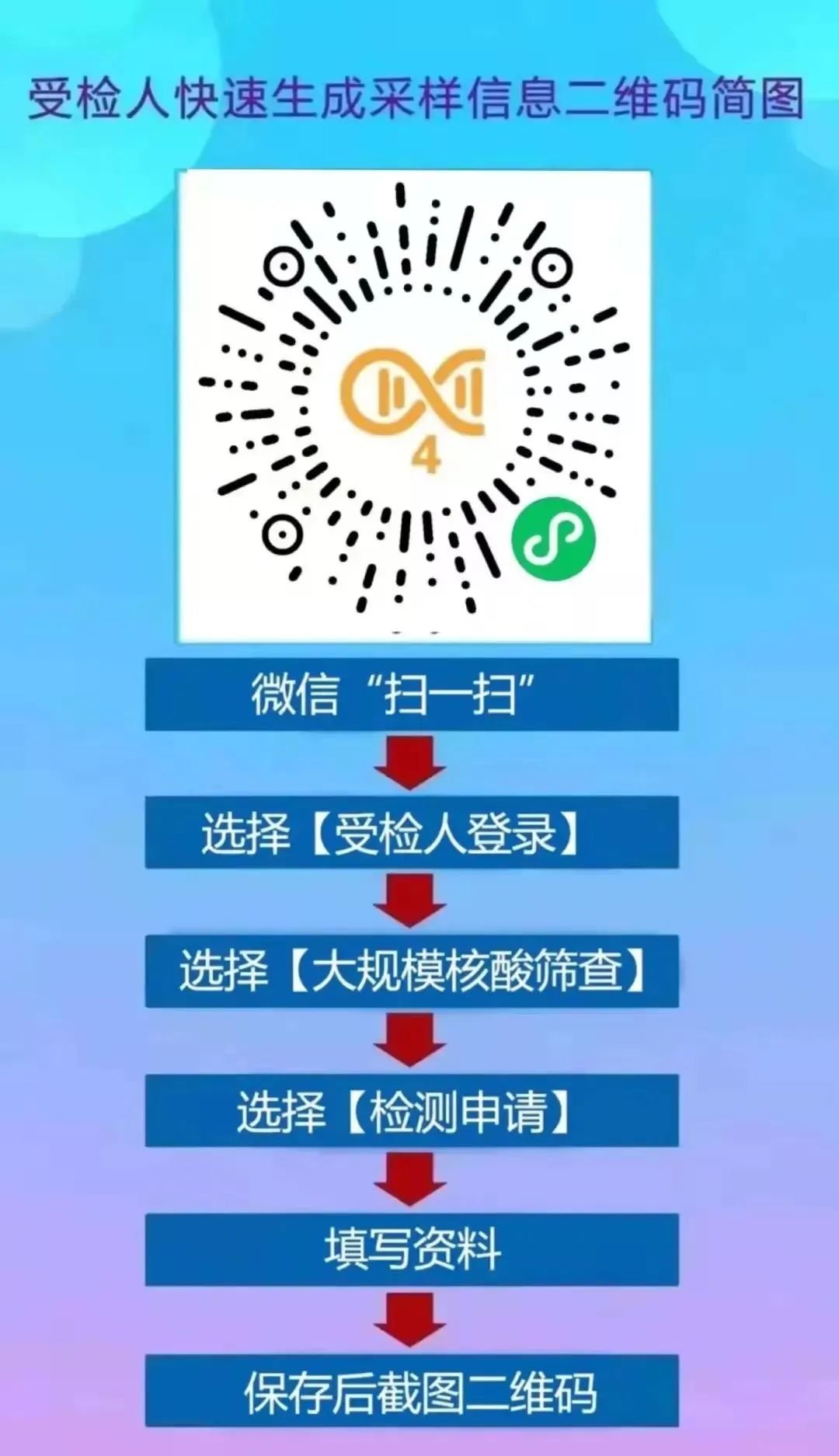 为提高检测效率,请提前在家录入信息,并截图保存二维码(之前已申请的依然有效),到采样点后直接向工作人员展示二维码截图,减少等候。现场检测带上有效身份证件供核验。