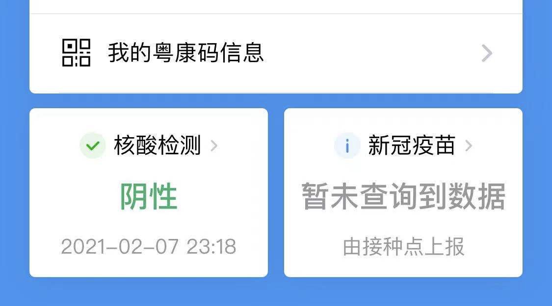 小提示:目前做过核酸检测的市民扫“粤康码”时,界面会显示近期做过的核酸检测结果,接种了新冠疫苗的话也会显示哦!