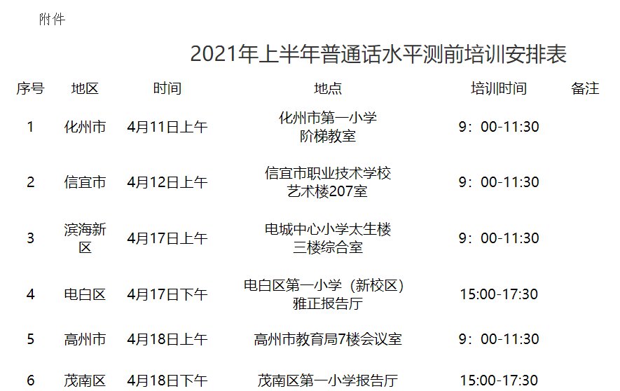 茂名市2021年上半年普通话水平测试将在4月19日开考,根据普通话水平测试工作的需要,使考生更好地了解普通话测试的流程和要求,考出更好的成绩,决定开展普通话水平测前培训工作。现将2021年上半年普通话水平测前培训工作通知如下: