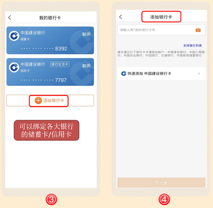 (3)绑定银行卡(储蓄/信用)开通钱包并充值。