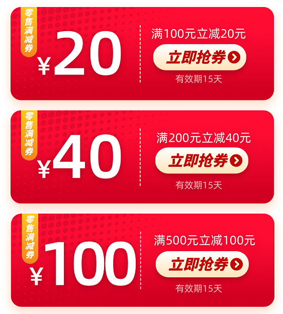 发放面值设为100元立减20元、200元立减40元、500元立减100元三种。
