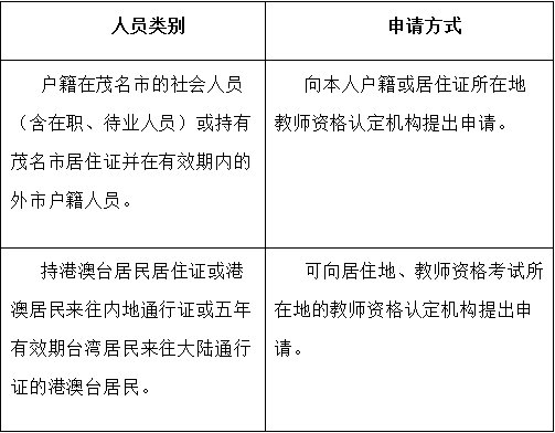 根据有关文件规定,茂名市教育局不直接受理个人申请和现场资料审核,请各申请人到相应的区、县级市教育局提出申请。因滨海新区和高新区不属于行政区,暂由电白区教育局受理滨海新区和高新区的教师资格认定申请。