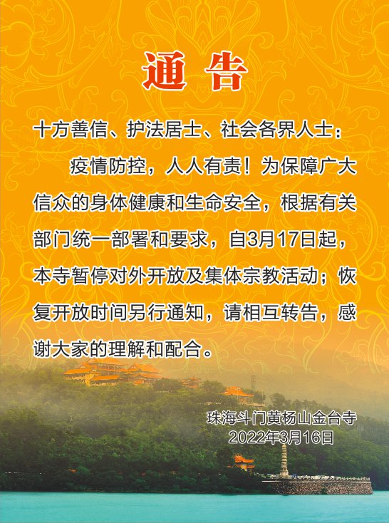 鉴于近期新冠疫情防控形势,为进一步加强疫情防控工作,保障广大信众的身体健康与生命安全,根据有关部门统一部署和要求,珠海普陀寺即日起实施“双暂停”管理(暂停对外开放,暂停集体宗教活动),恢复开放时间将另行通告。