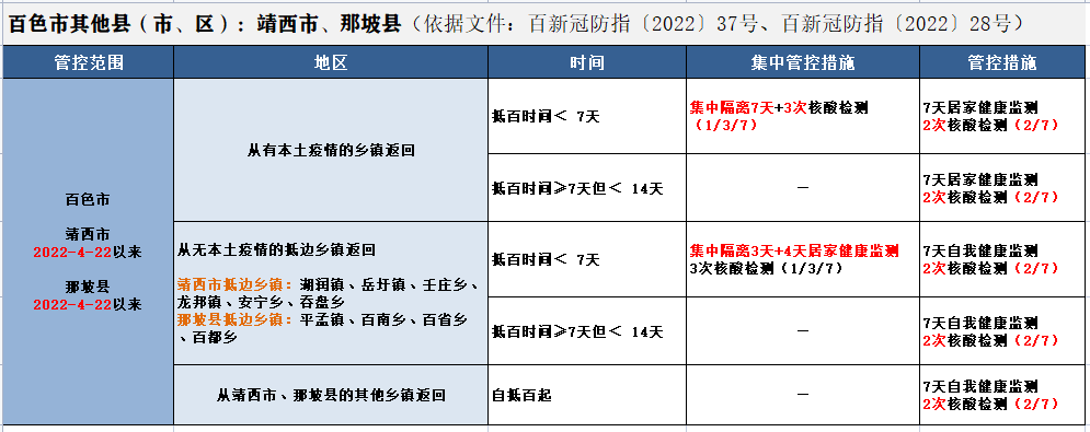 有以下地区旅居史,或与阳性感染者活动轨迹有交集的来(返)百色的市民,请提前 24 小时向目的地社区(村、屯)报备,在抵百后 12 小时内向目的地社区(村、屯)报告,纳入社区管理,并配合做好医学隔离观察或健康监测等健康管理工作。