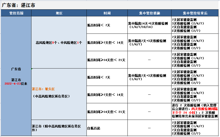 已由中高风险降至低风险的地区,该地区及所在县(市、区)或直辖市街道来桂返桂人员,实行7天自我健康监测+2次核酸检测。