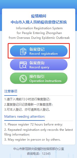 为进一步落实“外防输入、内防扩散”的工作要求,做好境外来(返)中山人员的健康服务工作,请近期从境外来(返)中山的海外乡亲、国际友人,于入境前72小时登陆“中山市入境人员防疫信息登记系统”登记个人健康和行程情况,并请国内的亲朋好友或单位将来(返)中山人员信息告知所在社区(小区)。