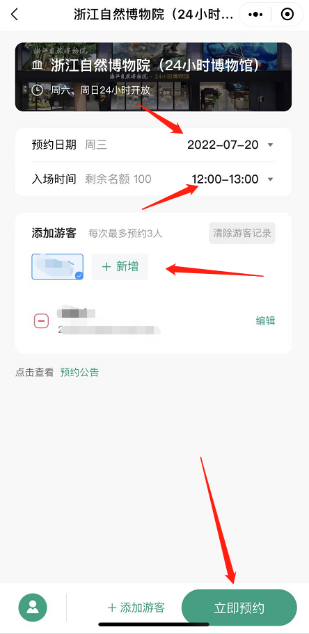 1、点完“码上预约”会显示预约公告,建议阅读,然后点击“我知道了”,进入下一页面,从上到下依次填写“预约日期”-“入场时间”-“添加游客”最后点击右下角“立即预约”。