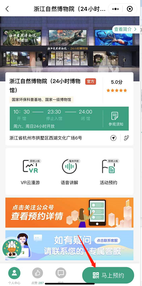 微信端搜索“文旅绿码”官方小程序,进入之后在首页搜索“浙江自然博物院24小时博物馆”,点击进入,然后点击右下角“马上预约”进行预约