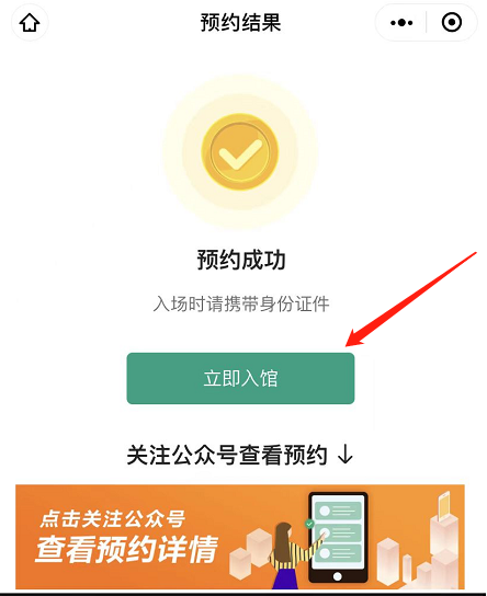 2、接着会显示预约成功的页面,入馆的时候,点击“立即入馆”,就可以核验预约码入馆游览啦