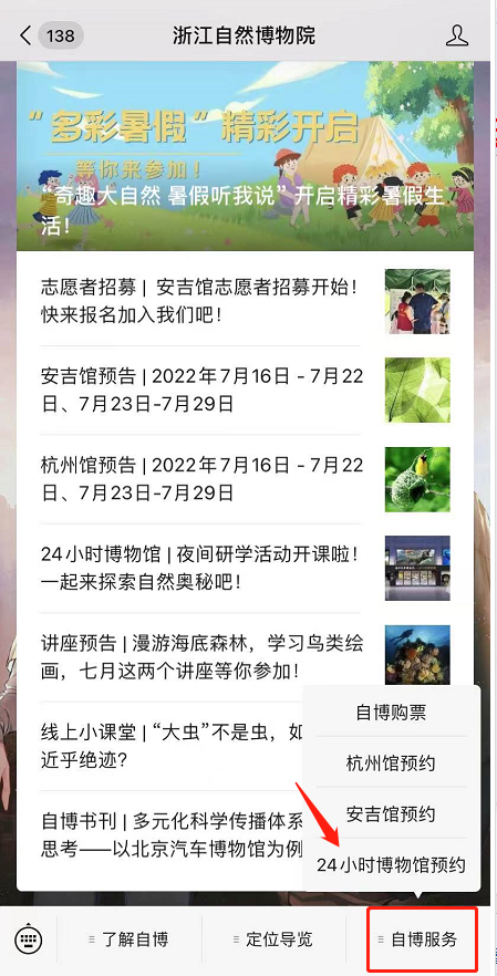 关注“浙江自然博物院”官方公众号,点击菜单栏“自博服务”-“24小时博物馆预约”既可以进入预约页面,然后点击右下角“马上预约”进行预约