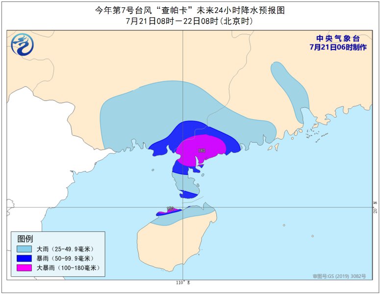 降水预报:21日08时至22日08时,广东中西部沿海、广西东南部、海南岛西北部等地的部分地区有暴雨到大暴雨(100-180毫米)。