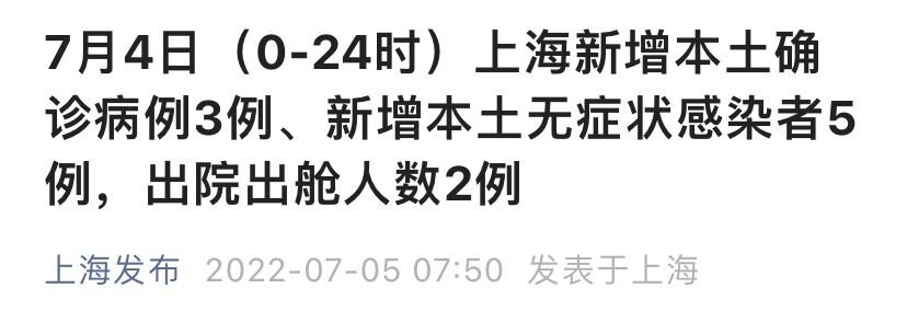 上海市卫健委7月5日通报:2022年7月4日0—24时,上海新增本土确诊病例3例和无症状感染者5例,其中2例确诊病例和5例无症状感染者在隔离管控中发现,1例确诊病例在风险人群筛查中发现,详情如下。