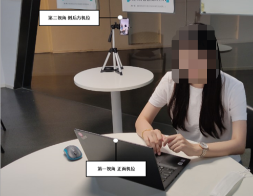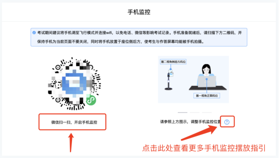 3.双监控操作:完成人证核实后,需要按照图示:使用手机微信扫一扫,扫描屏幕上的二维码,并按照要求摆放好手机的位置(建议侧后方,准备手机支架角度更佳),确保监考人员可以看到考生的电脑屏幕和考生本人。
