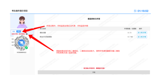 6.监考意外中断:如图所示:手机监控出现“红点”代表手机监控掉线重新连接办法:将鼠标移动至灰色二维码处,二维码会自动放大,重新使用手机扫描二维码,手机会再次进入监控状态。