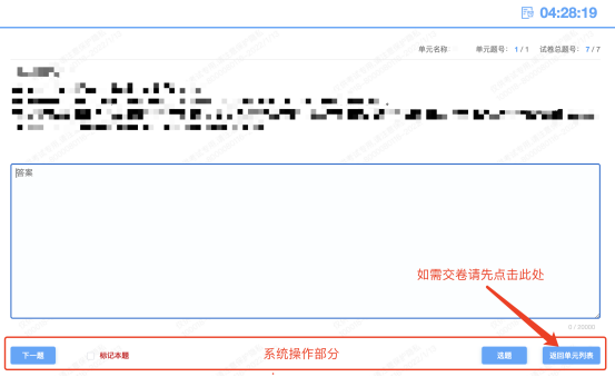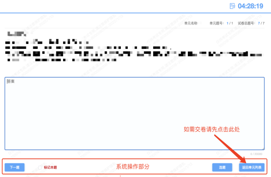 考试右上角为考试倒计时,注意答题时间;系统底部按钮为主要操作部分,除了选题操作,可以“标记本题”,后续通过“选题”来查看特别标记的试题,如需交卷先点击“返回单元列表”回到主界面。