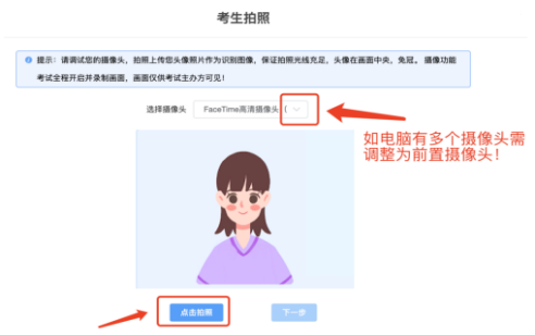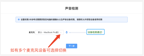 进入考试系统后按照图示依次完成麦克风和摄像头的调试