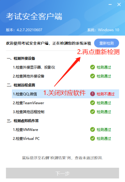 1.进入考试系统:打开考试客户端后,系统会进行环境检测,请提前关闭微信、QQ、Team Viewer等无关软件,如提示检测不通过,先彻底关闭对应软件,再点“重新检测”,检测通过后点击“下一步”。