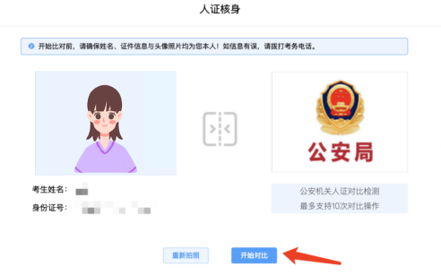 2.身份认证:拍照完成后需进行人证核身,姓名,身份证号与真实信息一致才能比对通过。