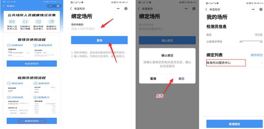 场所检测员是每个场所(企业、居民小区、村庄、饭店和酒店等区域都可定义为场所)的检测人员,可根据场所的规定对出入该场所的人员进行“粤康码”的扫描。