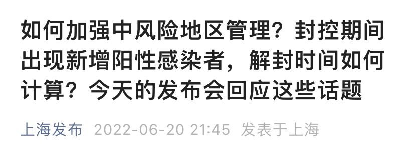 2022年6月20日17时,举行上海市新冠肺炎疫情防控工作第217场新闻发布会,市卫健委副主任赵丹丹回应中风险地区管控措施及解封时间计算方式。
