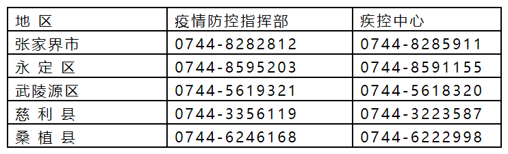 ▲张家界市市县两级疫情防控指挥部和疾控中心24小时值班电话