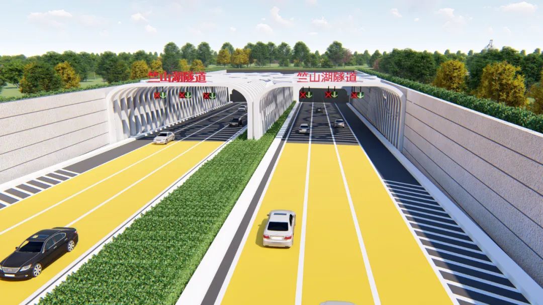竺山湖隧道从无锡马山侧下穿竺山湖,向西在宜兴侧周铁镇接地隧道全长7740米,其中暗埋段长7210米,马山侧敞开段长约275米、周铁侧敞开段长约255米。全线按一级公路标准建设,设计速度100公里/小时。