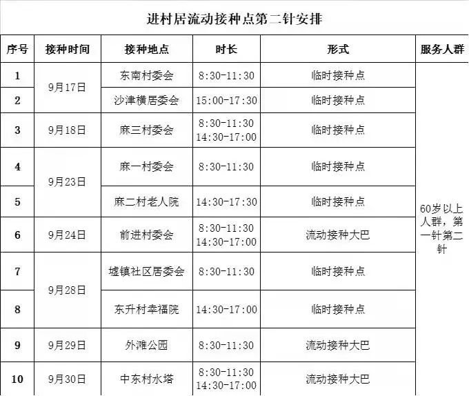 江海区外海街道新冠疫苗流动接种点9月17-30日提供接种服务,具体安排如下: