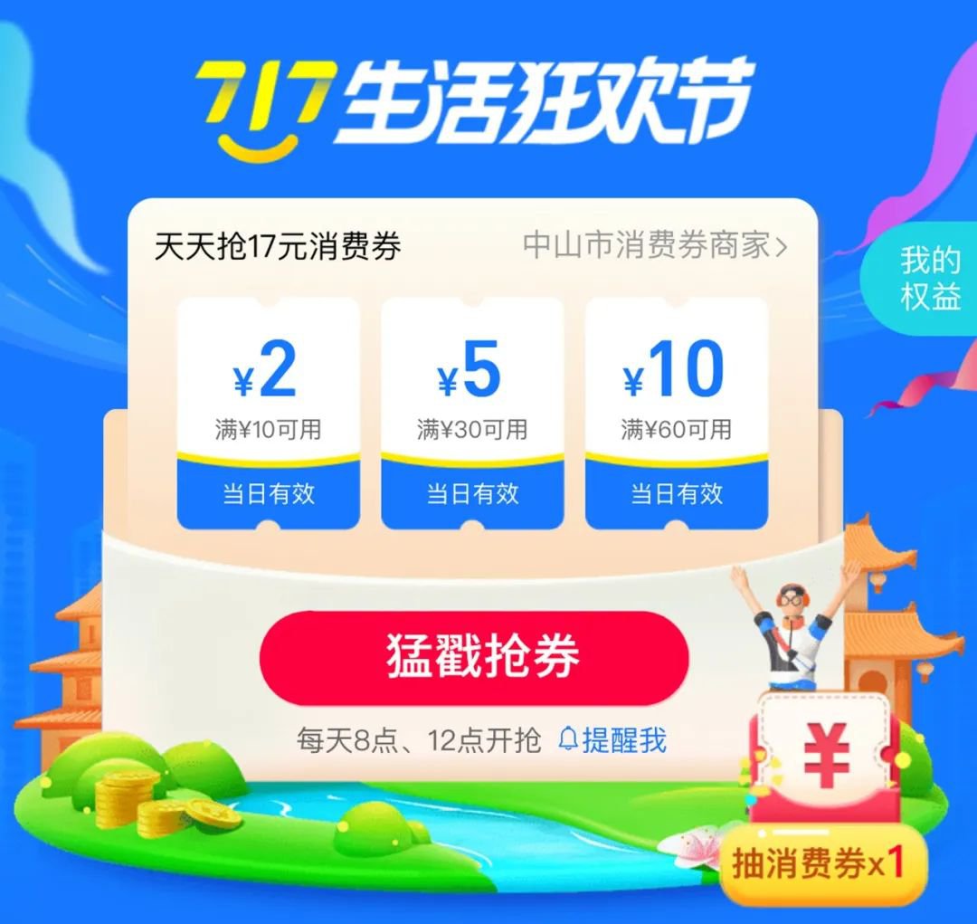 温馨提示:以下为717的活动,目前活动已经结束了。中山最新的支付宝消费券是国庆中秋消费券,可以在支付宝领取然后到线下商场商圈使用: