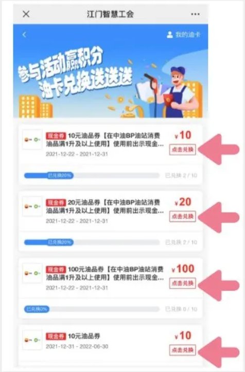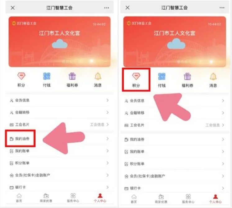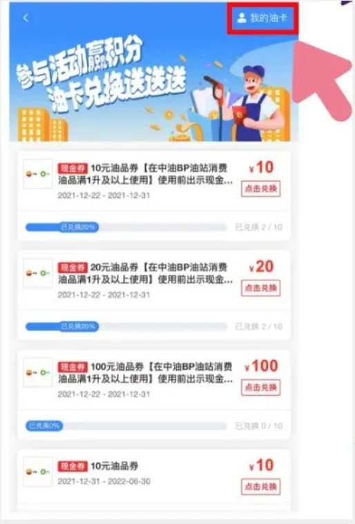 进入[个人中心],点击[我的油券],进入页面进行兑换。或进入[个人中心],点击[积分],进入页面[油卡兑换]后进行兑换。