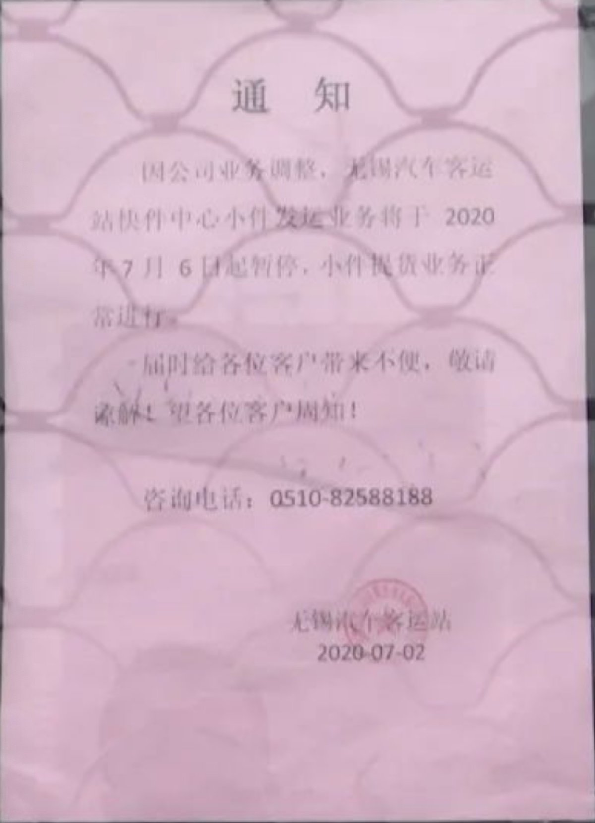 请注意!客运站的快件托运点已经不提供服务了,客运站的快件托运中心外紧闭的大门上贴着一张通知显示从7月6日起停止开放