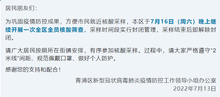 青浦区7月16日全员核酸筛查通知