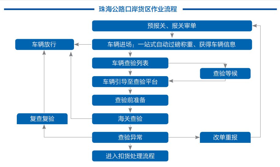 珠海公路口岸设有出入境货检场,货检场采用一站式闸口通关模式。