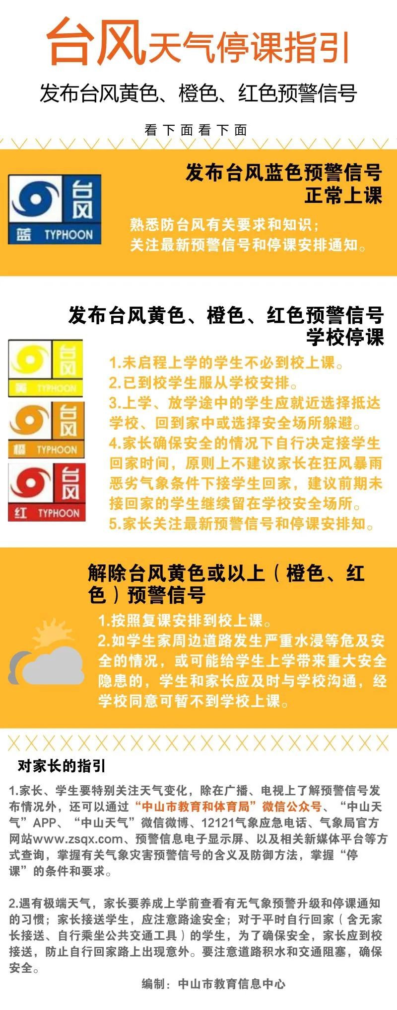 中山市民只要看到中山市气象局通过广播、电视、报纸、网络等媒体和手机发布的台风暴雨高级别预警信号,孩子即可放心地呆在家中,无须确认教育部门或学校有没有发通知。