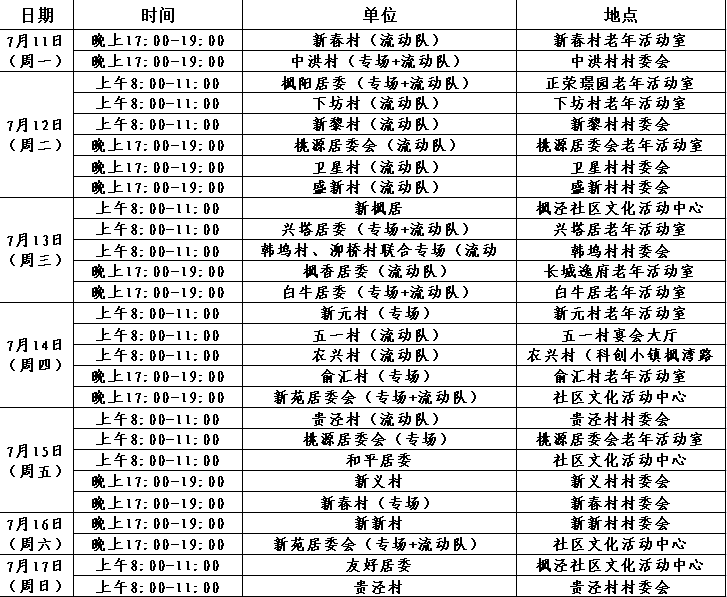 枫泾镇7月11日至7月17日新冠疫苗接种安排