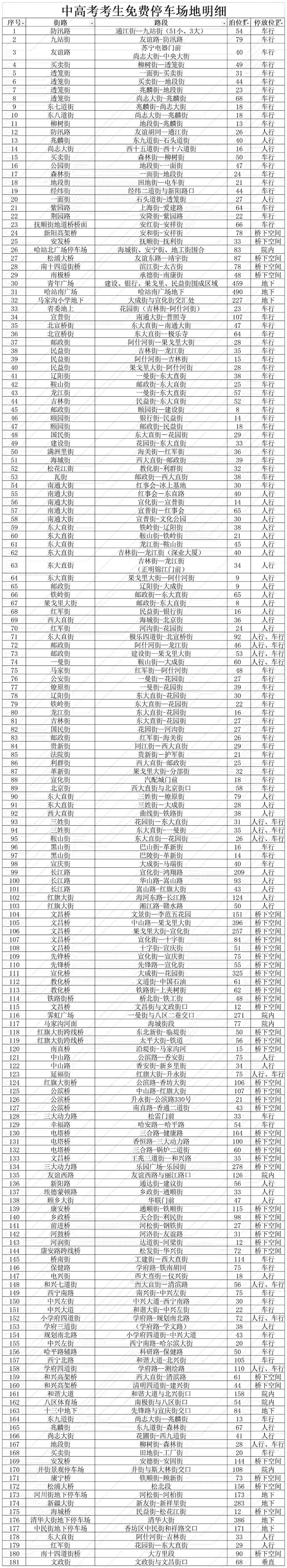 中高考考生免费停车场地明细表