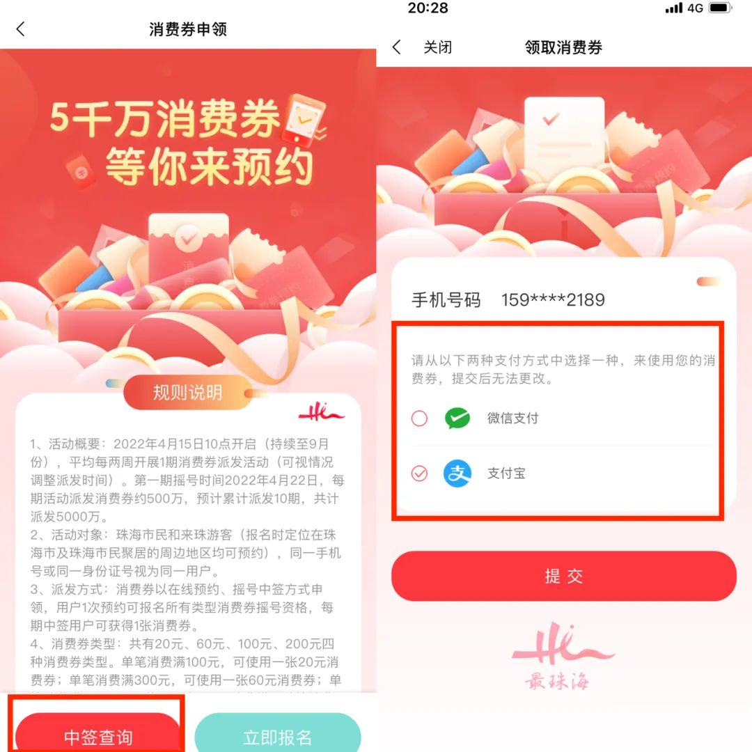 中签用户凭手机号及手机验证码登陆“最珠海”平台,在中签48小时内登录“最珠海”APP(逾期未领券将失效),进入首页-消费券申领-中签查询-选择支付渠道(微信、支付宝)-完成领券。领取后,消费券发放至对应平台的卡包。