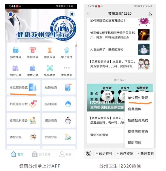 集体单位可以通过健康苏州掌上行app或苏州卫生12320微信公众号,点击“单位预约登记”进入登记界面,按要求填写相关信息。