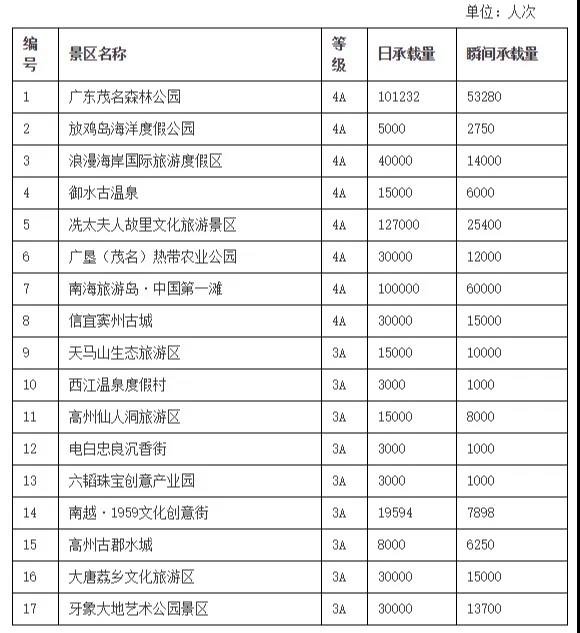 表中显示,广东茂名森林公园日承载量是101232人,放鸡岛海洋度假公园日承载量是5000人。浪漫海岸国际旅游度假区日承载量是40000人。