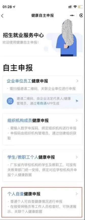 第二步:进入健康申报后,点击个人自查健康申报。