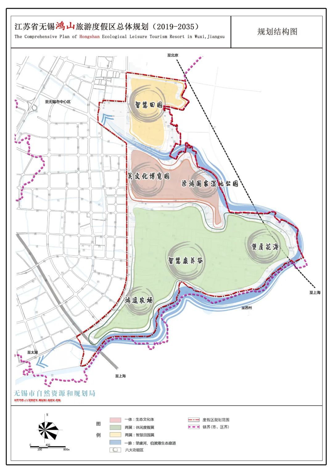 “一脉六区”:“一脉”为依托伯渎港——望虞河的生态廊道,“六区”是构成“一体两翼”的组成部分,其中,“一体”包括吴文化博览园和梁鸿国家湿地公园两个功能片区,智慧田园翼由智慧田园片区构成,休闲度假翼由望虞花海、智慧康养谷和鸿逗农场三个功能片区组成。