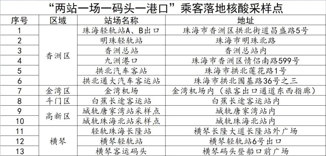 为进一步巩固我市得来不易的疫情防控稳定形势,我市将强化核酸检测筛查措施,国内中高风险地区所在地市来珠海人员,以及有阳性病例报告的地区所在地市来珠海人员,需持48小时内核酸检测阴性证明,同时接受落地核酸检测,采样完成即可离开。