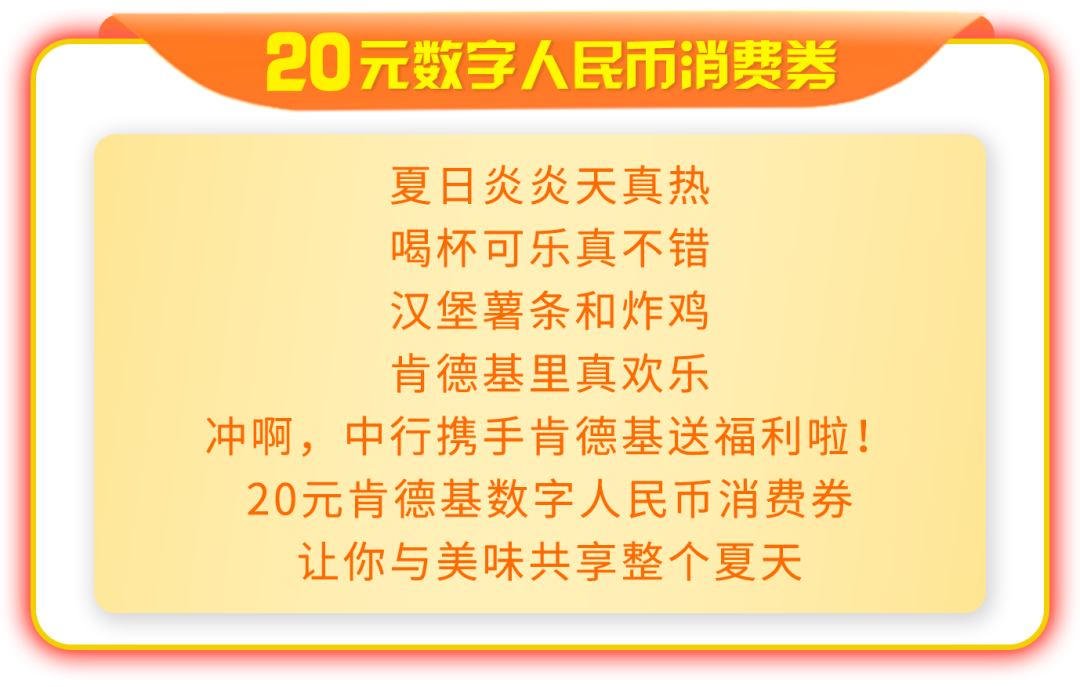 活动期间,大连分行手机银行客户可在中行手机银行APP“生活(定位大连)-本地专属-惠享肯德基”专区报名免费领取肯德基数字人民币消费券,每张消费券面值20元,可在肯德基APP(定位大连)下单时选择数字人民币时抵扣,每名客户每月限领取一张。消费券每日名额有限,按报名时间先后,先报先得,额满即止。
