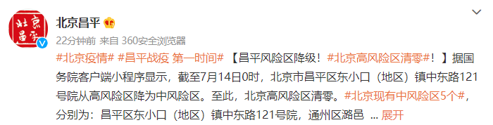 据国务院客户端小程序显示,截至7月14日0时,北京市昌平区东小口(地区)镇中东路121号院从高风险区降为中风险区。至此,北京高风险区清零。