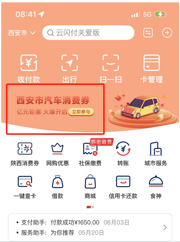 下载后进入首页,点击西安汽车消费券页面