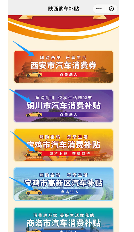 之后选择各个地市,区县的汽车消费券,进入申请入口即可